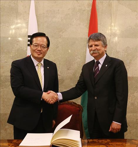 (부다페스트=연합뉴스) 양태삼 특파원 = 헝가리를 방문한 정의화 국회의장은 10일 부다페스트의 헝가리 국회를 방문해 쾨베르 라슬로 국회의장을 만나 두 나라가 형제처럼 지내자고 말했다.