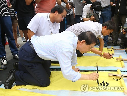 | △ 만장 쓰는 박원순 시장 (서울=연합뉴스) 김도훈 기자 = 11일 오후 서울 광화문광장에서 열린 세월호 참사 희생자 가족 천막농성 1주년 기념행사에서 박원순 시장이 희생자들을 위한 만장을 쓰고 있다.2015.7.11 superdoo82@yna.co.kr |