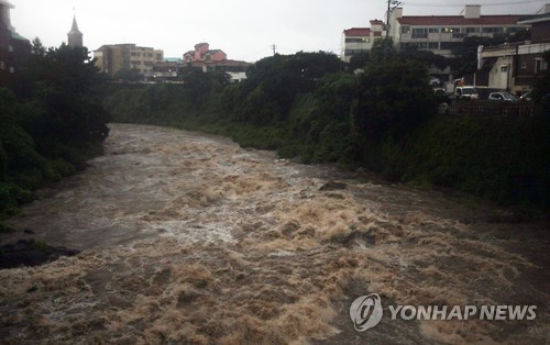 | △ 태풍 찬홈 북상…집중호우에 불어난 제주 하천 (제주=연합뉴스) 전지혜 기자 = 11일 북상하는 태풍 찬홈 영향으로 한라산에 최고 600㎜가 넘는 많은 비가 내린 가운데 제주시 한천에 빗물이 모여 흐르고 있다. |