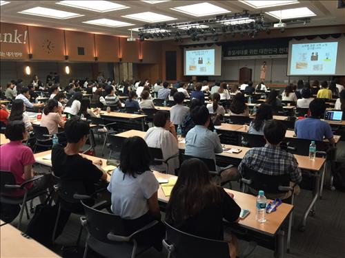 탈북청년모임 '위드유'(with-U)가 11일 서울 중구 외환은행 대강당에서 개최한 '광복 70주년 기념 통일세대를 위한 대한민국 현대사강좌'. 주제는 '박사 대통령과 고졸 대통령'이었다.