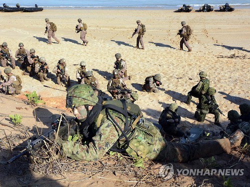 | △ (노던 테리토리<호주> 교도=연합뉴스) 11일 호주 북부의 준주(準州)인 노던 테리토리의 포크베이 지역 해안에서 미군과 호주군의 연합군사훈련에 처음 참가한 일본 자위대원이 미국 해병대원과 함께 총기를 들고 섬 탈환 작전을 수행 중이다. 2015.7.12 |