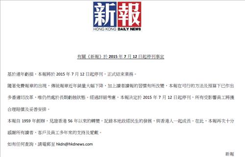 56년 역사의 홍콩 신보(新報)는 12일 홈페이지에 게시한 공고문에서 무가지에 따른 부수 감소와 과거 수년간 발생한 적자 등을 고려해 이날부로 폐간한다고 밝혔다.