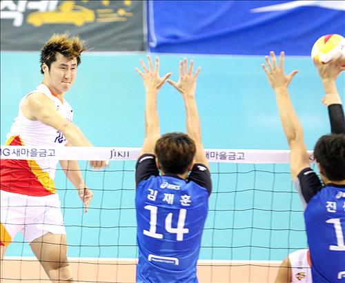 | △ 한국전력 박성률(왼쪽)이 스파이크를 때리고 있다. <한국배구연맹 제공> |