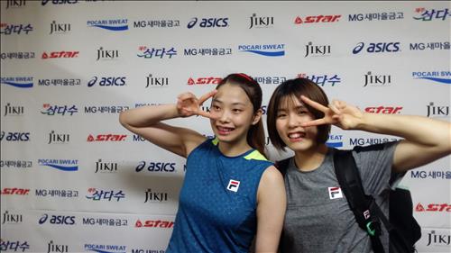 | △ (청주=연합뉴스) 김지헌 기자 = 흥국생명 공윤희(왼쪽)와 이재영이 12일 충북 청주실내체육관에서 2015 청주-KOVO컵 프로배구대회 GS칼텍스전을 승리로 이끌고 수훈선수 인터뷰를 마친 다음 포즈를 취했다. 공윤희는 입단 2년 만에 처음으로 선발 출전해 팀의 승리에 힘을 보탰다. jk@yna.co.kr |