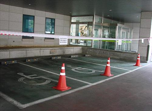 | △ (서울=연합뉴스) 서울의 한 건물 주차장 장애인 전용 주차 공간에 몰래 차를 대려는 얌체족을 막으려 라바콘이 설치돼 있다. 2015.7.13 << 장애인제도개선솔루션 제공 >> |