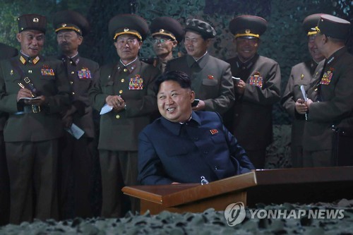 | △ 야간군사연습 참관하는 김정은 (서울=연합뉴스) 김정은 북한 국방위원회 제1위원장이 제10군단 산하 지상포병 구분대와 해군 동해함대 전투함선이 참여한 야간 해상화력타격연습을 참관했다고 노동신문이 16일 보도했다. 북한이 '정부 성명'을 통해 남한과의 대화 가능 의지를 밝힌 다음날 군사연습 소식을 공개한 것이다. 사진은 간부들에게 둘러싸여 군사연습을 참관 중인 김정은 제1위원장. 숙청된 현영철 후임으로 인민무력부장에 올랐을 가능성이 유력한 박영식 인민군 대장도 김 제1위원장의 오른쪽 뒤편에서 웃고 있다. 2015.6.16 nkphoto@yna.co.kr |