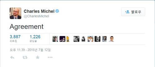 그리스와 유럽의 운명을 두고 17시간 가까이 지루하게 이어지던 정상회의가 드디어 끝났다는 것, 그리고 양측이 마침내 타결을 이뤘다는 것을 미셸 총리는 누구보다 먼저 트위터를 통해 알렸다.