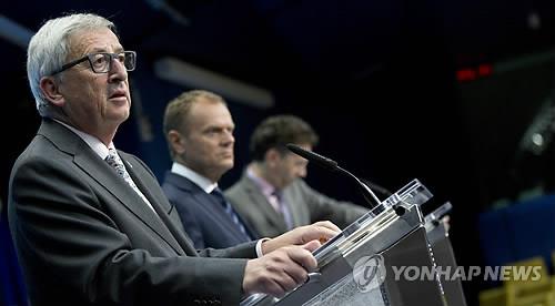 | △ 브뤼셀 AP=연합뉴스) 유로존(유로화 사용 19개국) 정상들은 13일(현지시간) 그리스가 추가 개혁안을 이행하는 조건으로 유럽재정안정화기구(ESM)와 3차 구제금융 협상을 개시하는 방안에 합의했다. 회담 후 기자회견하는 장-클로드 융커 EU 집행위원장, 도날드 투스크 EU 정상회의 상임의장, 예룬 데이셀블룸 유로그룹 의장.(사진 왼쪽부터) |
