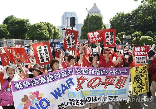 | △ (도쿄 교도=연합뉴스.자료사진) 6월 20일 도쿄 국회의사당 주변에서 여성들이 '분노'를 전하는 의미에서 빨간 티셔츠나 스카프 등을 착용한 채 '인간 사슬' 시위를 벌이는 모습. '여성의 평화, 6·20 국회 인간사슬'이라는 이름이 붙은 이 행사에는 약 1만 5천 명(이하 주최측 발표)이 참석해 법안 반대에 대한 목소리를 높였다. 2015.6.21 jhcho@yna.co.kr |