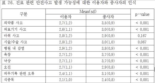 한국보건의료연구원(보의연)는 14일 '이용자 및 종사자의 병원안전 인식도 조사연구'(연구책임자 김수경·유명순) 보고서를 발표했다.