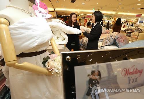 | △ 지난 1월 웨딩 페어 행사가 열린 서울시내 한 백화점 침구 매장의 모습.<연합뉴스 자료사진> |