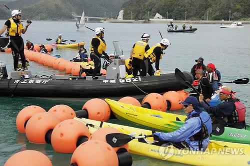 | △ 미군 후텐마(普天間)비행장 이전 예정지인 오키나와(沖繩)현 본섬 북쪽 헤노코(邊野古) 연안에서 고무보트에 탄 일본 해상보안청 관계자와 카누에 탄 기지 이전 반대파가 대치하고 있다.(교도=연합뉴스 자료사진) |