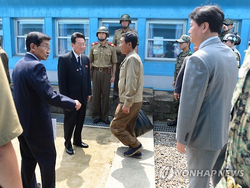 (서울=연합뉴스) 김호준 기자 = 정부가 14일 판문점에서 남북 접촉을 갖고 지난 4일 우리 해경이 울릉도 근해에서 구조한 북한 선원 5명 중 북측으로 돌아가기를 희망하는 2명을 송환했다.