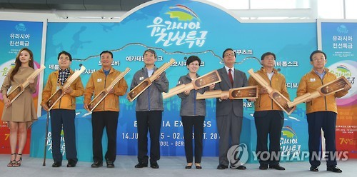 | △ 유라시아 친선특급 발대식 (서울=연합뉴스) 김도훈 기자 = 14일 오전 서울역에서 열린 유라시아 친선특급 발대식에서 최연혜 코레일 사장, 조태용 외교부 차관 등을 비롯한 참석자들이 축하 세리머니를 하고 있다. 19박 20일간 진행되는 이번 행사는 유라시아 역내 국가간 경제협력을 강화해 통일의 초석을 쌓자는 박근혜 대통령의 '유라시아 이니셔티브' 구상의 하나로 진행되며 정·재계와 학계, 문화계 인사와 대학생 등 200명이 참가한다. |