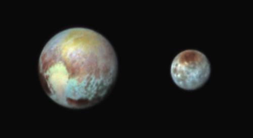 미국 항공우주국(NASA)은 뉴호라이즌스에 실린 '랠프' 관측 장비의 컬러 필터 3개를 써서 얻은 명왕성과 그 위성 카론의 사진을 14일(이하 한국시간) 공개했다.