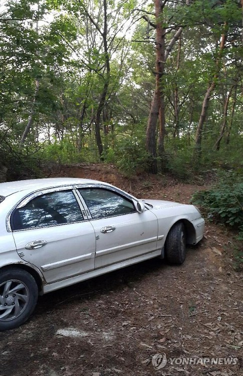 | △ 납치 용의자 숨진 현장 인근서 발견된 승용차 (수원=연합뉴스) 14일 경기 수원에서 술에 취해 길거리에서 자는 A(22·여)씨를 납치한 것으로 추정되는 용의자 C(46)씨가 강원 원주의 한 저수지 인근 야산에서 목을 매 숨진 채 발견됐다. 저수지 인근에서는 C씨가 타고 다닌 것으로 추정되는 차량이 발견됐다. 경찰은 감식을 벌이고 있다. 2015.7.14 <<독자 제공>> you@yna.co.kr |
