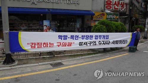 | △ "갑질 달서구의원 사퇴하라" (대구=연합뉴스) 대구 달서구청 공무원노조가 한 구의원의 과도한 행정 개입 등에 반발해 15일부터 해당 구의원 지역구에서 공개 사과 등을 촉구하는 1인 릴레이 시위를 벌이고 있다.2015.7.15 <<전국공무원노동조합 달서구지부>> suho@yna.co.kr |