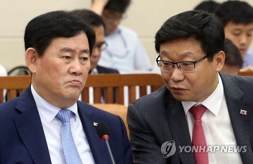 | △ 제1차관과 이야기하는 최경환 장관 (서울=연합뉴스) 도광환 기자 = 최경환 부총리 겸 기획재정부 장관이 15일 오전 국회에서 열린 기획재정위원회에서 주형환 제1차관과 이야기를 나누고 있다. |