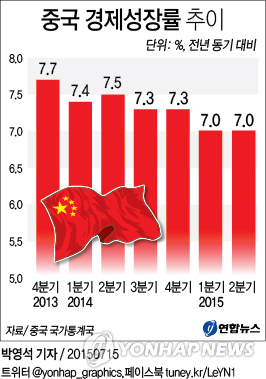 (서울=연합뉴스) 김남권 기자 = 중국의 2분기 국내총생산(GDP)이 지난해 같은 기간보다 7.0% 성장했다고 중국 국가통계국이 15일 밝혔다.
