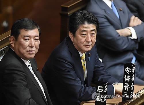 | △ 이시바 시게루(왼쪽) 지방창생담당상과 아베 신조 일본 총리(EPA=연합뉴스 자료사진) |