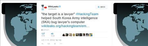 위키리크스는 14일(현지시간) 트위터를 통해 해킹팀이 2013년 9월 16∼17일 'SKA'(South Korea Army Intelligence)를 도와 한 변호사의 컴퓨터에 해킹 프로그램을 설치(bug)했다는 내용을 담은 이메일을 공개했다.