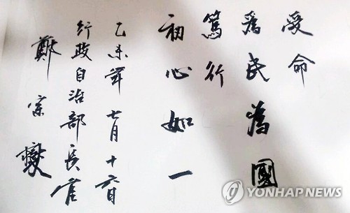 | △ 정종섭 장관이 쓴 안중근 기념관 방명록 (서울=연합뉴스) 정종섭 행정자치부 장관이 취임 1주년을 하루 앞둔 16일 출근 전 서울 남산 안중근 의사 기념관을 방문해 쓴 방명록. 정 장관은 방명록에 '受命 爲民爲國, 篤行 初心如一'(수명 위민위국, 독행 초심여일)이라는 글귀를 남겼다. 2015.7.16 << 정종섭 장관 페이스북 캡처 >> photo@yna.co.kr |