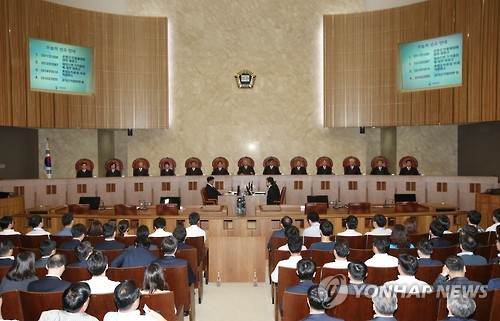| △ '대선개입 혐의' 원세훈 전 국정원장 최종심 선고 (서울=연합뉴스) 임헌정 기자 = 양승태 대법원장을 비롯한 대법관들이 국가정보원 대선개입 혐의로 항소심에서 실형을 받은 원세훈 전 국정원장에 대한 상고심 전원합의체 선고를 위해 16일 오후 서울 서초동 대법원 대법정으로 들어선 뒤 자리에 앉아 있다. |