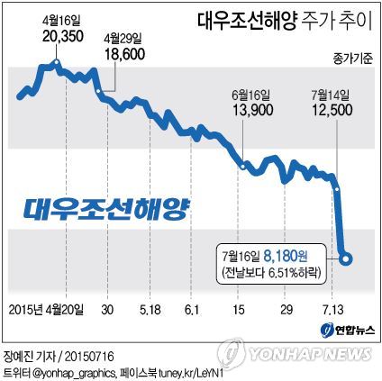 이날 유가증권시장에서 대우조선해양은 전날보다 6.51% 내린 8천180원에 거래를 마쳤다.