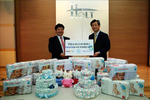 쿠팡은 16일 김철균 부사장이 1천800만원 상당의 친환경 어니스트 패션 기저귀를 김대열 홀트아동복지회 회장에게 전달했다고 밝혔다. 복지회는 이 기저귀들은 입양 대기 중인 위탁가정 아동, 미혼모 공동생활가정 아동 등에게 보낼 예정이다.