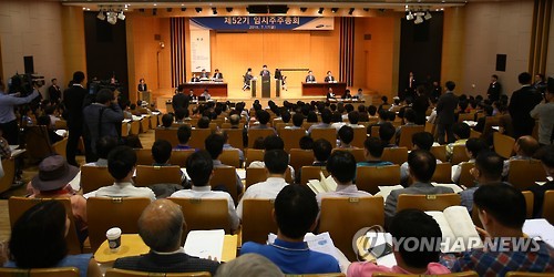 | △ '만석' 제일모직 임시 주주총회 (서울=연합뉴스) 한종찬 기자 = 17일 오전 서울 중구 태평로 2가 삼성생명 빌딩에서 제일모직 임시 주주총회가 열리고 있다. 이날 총회에서 삼성물산과의 합병계약서 승인의 건은 만장일치로 통과됐다. |
