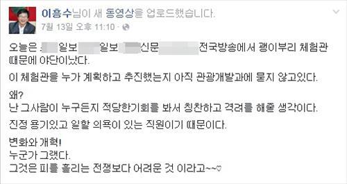 이 구청장은 앞서 구의회 부결로 쪽방촌 체험관이 백지화된 13일 자신의 페이스북에 '체험관을 누가 계획하고 추진했는지 아직 관광개발과에 묻지 않고 있다. 그 사람이 누구든지 적당한 기회를 봐서 칭찬하고 격려해 줄 생각이다'는 글을 썼다.