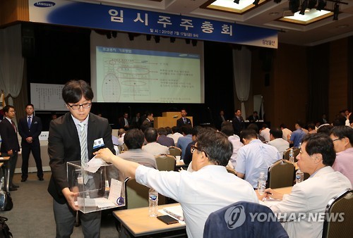 (서울=연합뉴스) 박대한 기자 = 엘리엇 매니지먼트의 등장으로 자칫 무산될 위기에 놓였던 제일모직과 삼성물산의 합병안이 주주들의 지지 속에 극적으로 통과했다.