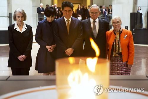 | △ 동남아 학자들이 아베 신조 일본 총리에게 위안부 문제 등 과거 태평양전쟁 당시 일본이 저지른 만행을 직시하고 진심어린 사과를 촉구하는 서한을 보냈다. 사진은 역사문제에 대한 사과를 하지 않고 있는 아베 총리가 지난 4월 미국 방문에서 워싱턴DC의 홀로코스트 박물관을 방문 묵념하는 모습. (AP=연합뉴스 자료사진) |