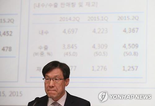 | △ 경영쇄신안 발표 뒤 권오준 포스코 회장 (서울=연합뉴스) 진성철 기자 = 권오준 포스코 회장이 15일 서울 여의도 한국거래소에서 개최한 기업설명회에서 경영쇄신안을 발표한 뒤 실적 보고 동안 굳은 표정을 짓고 있다. 2015.7.15 zjin@yna.co.kr |