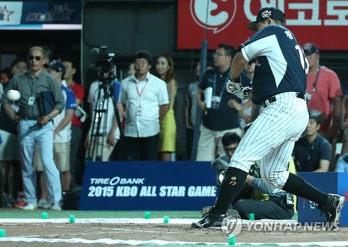 | △ 황재균의 홈런레이스 (수원=연합뉴스) 박정헌 기자 = 롯데 화재균이 17일 수원 KT위즈파크에서 벌어진 '2015 올스타 프라이데이 인터파크 홈런레이스'에 참가해 공을 치고 있다. 2015.7.17 home1223@yna.co.kr |