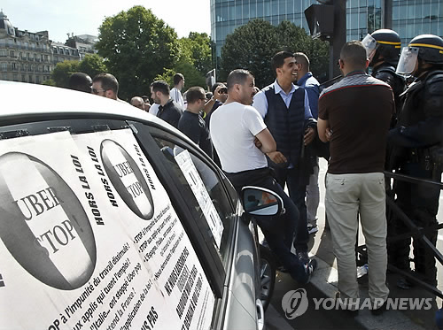 | △ '우버' 때문에 못 살겠어요 (파리 AP=연합뉴스) 25일(현지시간) 프랑스 파리에서 세계 최대 차량 공유서비스 '우버'에 항의해 파업 시위를 벌이는 택시 기사들이 폭동진압 경찰과 대화하고 있다. 택시 창문에 '불법 우버 운행 중단시키라'는 글귀의 포스터가 붙어 있다. 우버에 반대하는 기사들의 시위는 이날 프랑스 전역에서 열렸다. bulls@yna.co.kr Striking taxi drivers talk to riot police officers next to a cab with posters which read, "Stop Uber, out of law,"during a taxi drivers demonstration in Paris, France, Thursday, June 25, 2015. French taxis are on strike around the country, snarling traffic in major cities and slowing access to Paris' Charles de Gaulle airport after weeks of rising and sometimes violent tensions over Uber. (AP Photo/Michel Euler) |
