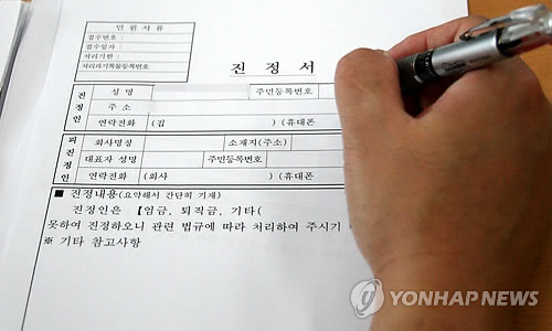 | △ 임금을 제 때 못받은 근로자가 진정서를 작성하고 있다. |