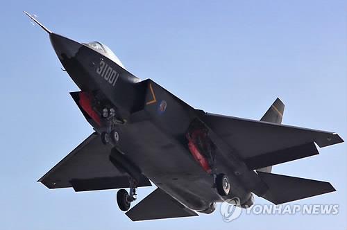 | △ 중국의 차세대 스텔스 전투기로 주목받는 젠(殲)-31. 미국의 스텔스 전투기인 F-35와 겉모습이 전체적으로 비슷하지만, 더 가늘고 날렵한 것이 특징이다.(연합뉴스=자료사진) |