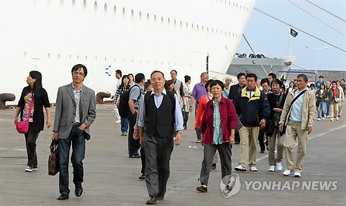 | △ 크루즈를 타고 제주항에 도착한 중국인 관광객들이 제주도를 돌아보기 위해 밖으로 이동하고 있다. (연합뉴스 자료사진) |