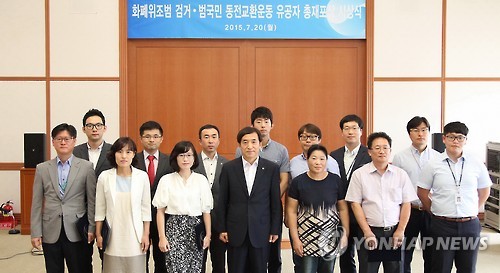 (서울=연합뉴스) 김지훈 기자 = 이주열 한국은행 총재는 20일 화폐위조범 검거와 동전교환운동에 기여한 개인과 단체에 대해 포상했다.