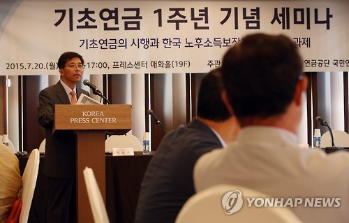 | △ 기초연금 1주년 기념 세미나 (서울=연합뉴스) 박동주 기자 = 20일 오후 서울 중구 프레스센터에서 열린 기초연금 1주년 기념 세미나에서 조남권 보건복지부 연금정책국장이 기초연금의 도입·시행 및 현황에 대해 발표하고 있다. |