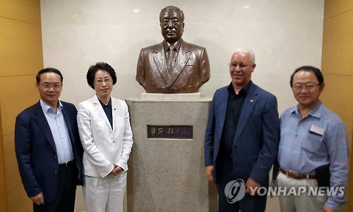 | △ 대한항공 테크센터 방문한 NASA 연구소 관계자 (인천=연합뉴스) 지난 17일 대한항공 항공우주사업본부 테크센터를 방문한 NASA 랭글리 연구소의 로버트 브라이언트 박사(왼쪽 세번째)가 한진그룹 창업주인 고 조중훈 회장의 흉상 앞에서 최순자 인하대 총장(두번째)과 기념촬영을 하고 있다. 2015.7.20 <<인하대 제공>> |