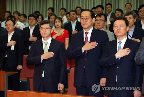 | △ 이득홍 신임 서울고검장 취임식 (서울=연합뉴스) 박동주 기자 = 이득홍 신임 서울고검장(앞줄 오른쪽 세번째)이 21일 오전 서울 고등검찰청에서 열린 취임식에서 국기에 대한 경례를 하고 있다. |
