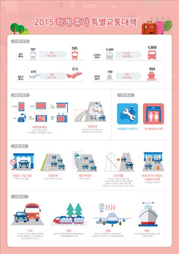 국토교통부는 7월24일부터 8월9일까지 17일을 하계 휴가철 특별교통대책기간으로 정해 하루 평균 열차 8회, 고속버스 279회, 항공기 34편, 여객선 195회를 늘리는 등 특별대책을 시행한다고 21일 밝혔다.