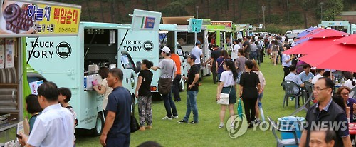 (수원=연합뉴스) 최찬흥 기자 = 21일 오전 경기도청 잔디운동장. 각양각색의 푸드트럭 20여 대가 손님 끌기에 여념이 없었다.