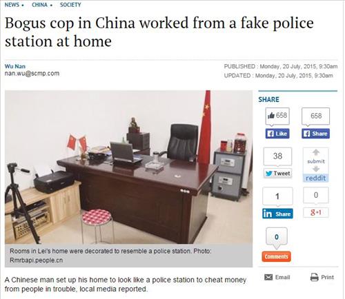 | △ 중국 우한에서 집안에 가짜 경찰서까지 꾸며놓고 경찰 행세를 하던 '레이'라는 이름의 남성이 '진짜' 경찰에 붙잡혔다. 사진은 홍콩 사우스차이나모닝포스트(SCMP) 인터넷판에 보도된 가짜 경찰서 모습을 캡쳐한 것. 2015.7.21 (서울=연합뉴스) |