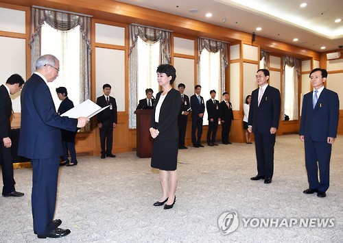 | △ 대법원, 故 박삼봉 원장 등에 황조근정훈장 전수 (서울=연합뉴스) 양승태 대법원장이 21일 서울 서초구 대법원에서 지난 1월 불의의 사고로 세상을 떠난 고(故) 박삼봉 전 사법연수원장의 부인 황미영 여사와 올해 상반기 퇴직한 박흥대·최우식 전 법원장에게 황조근정훈장을 수여하고 있다. 2015.7.21 << 대법원 제공 >> photo@yna.co.kr |