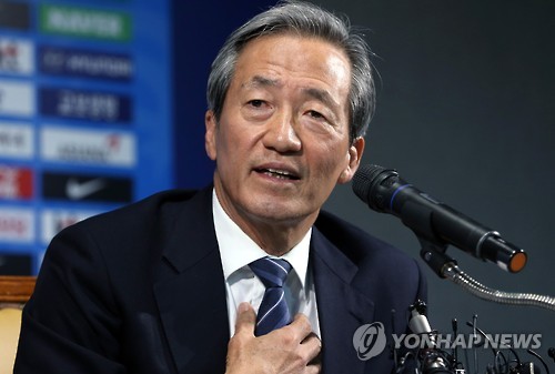 | △ 정몽준 FIFA회장 출마 (서울=연합뉴스) 정몽준 대한축구협회 명예회장이 21일 국제축구연맹(FIFA) 차기 회장 출마 의사를 공식적으로 밝혔다. 사진은 지난달 3일 축구회관에서 FIFA 스캔들 입장 밝히는 정몽준 명예회장. 2015.7.21 << 연합뉴스DB >> photo@yna.co.kr |