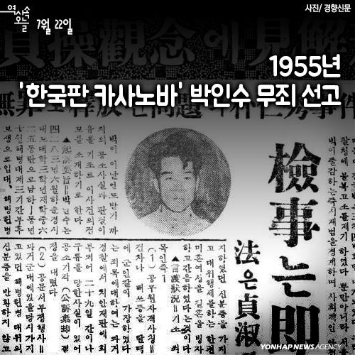 (서울=연합뉴스) 1955년 7월22일 서울지법에서 나온 판결이 사회적으로 큰 논란을 일으켰다. '한국판 카사노바'로 불린 26세 청년 박인수 피고인의 혼인빙자간음 혐의에 대한 무죄 판결이었다.
