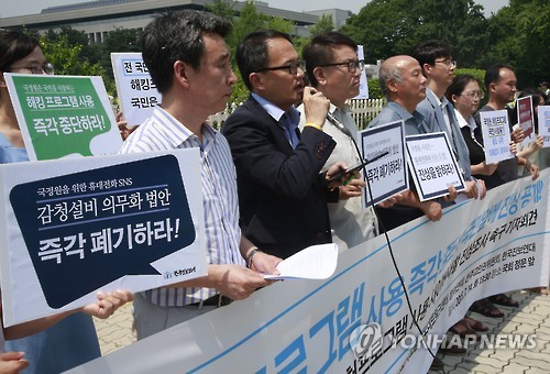 이들은 국정원이 이탈리아 정보기술(IT)업체 '해킹팀'으로부터 해킹 프로그램을 구입해 민간인을 사찰하고 악성 프로그램을 유포한 혐의에 대해 검찰이 수사해야 한다는 입장이다.